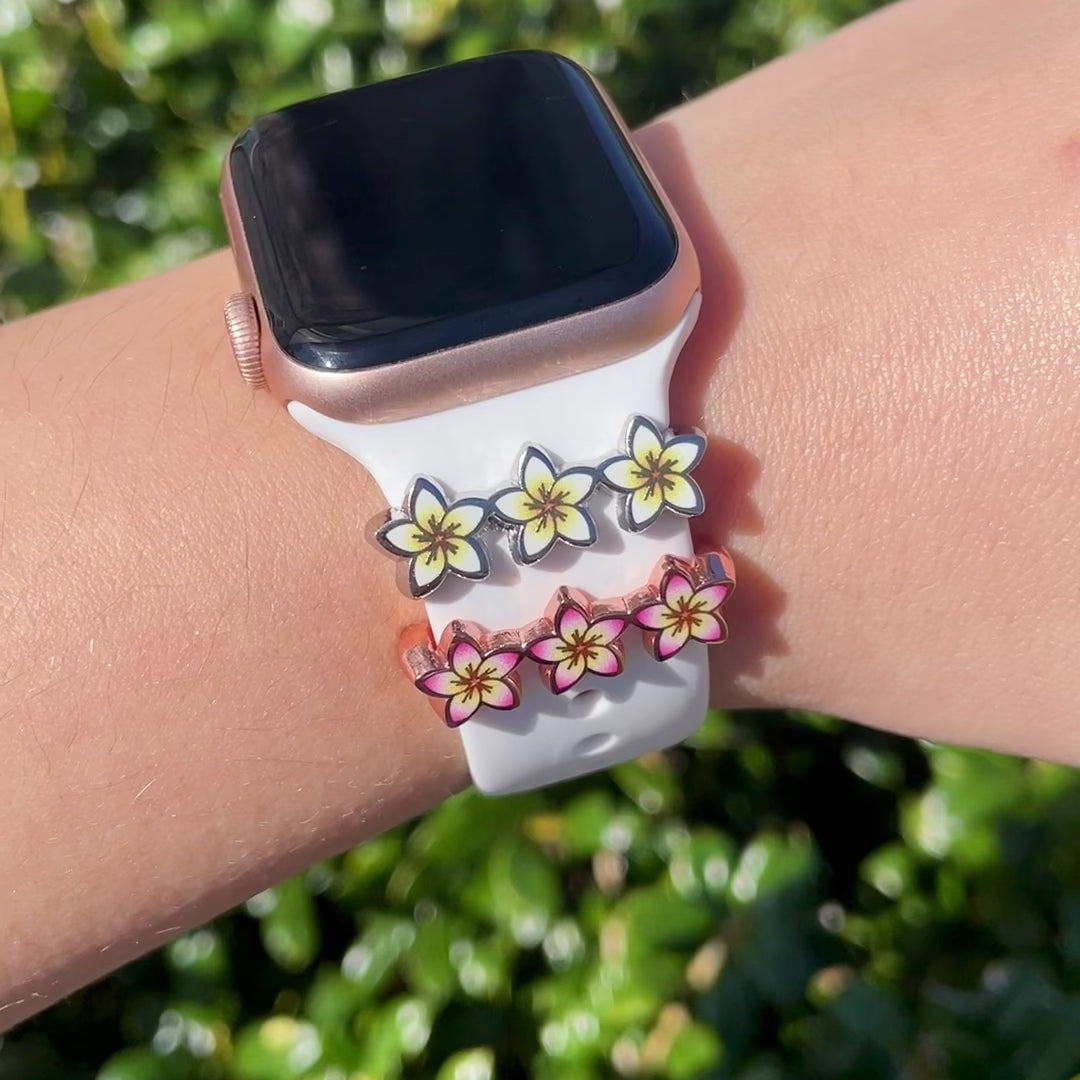 Charm Sliders simply slide onto most 20/22mm watch bands (this includes Apple Watches, FitBit Versa, Samsung Galaxy, and more)! They're easily interchangeable and add some sparkle and glam to any simple band!