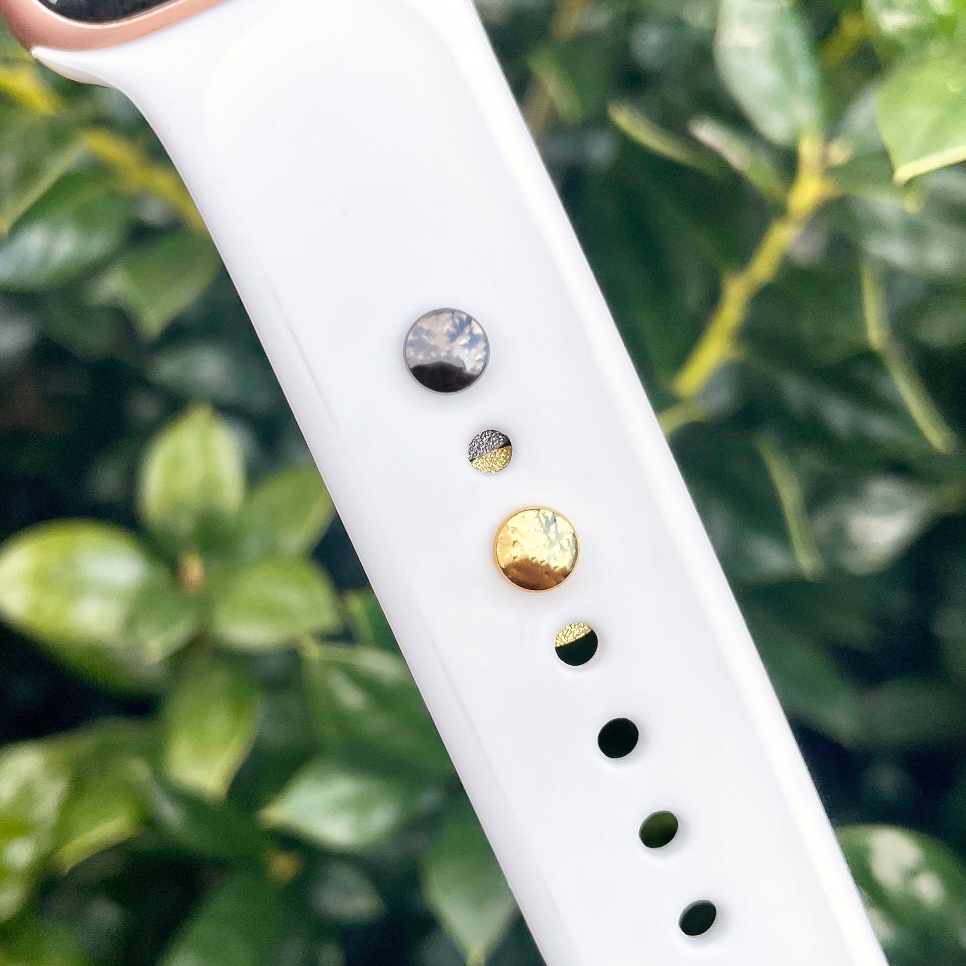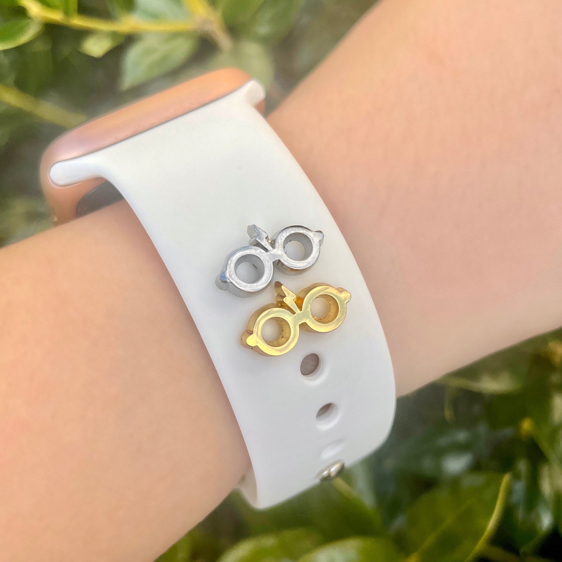Band Charms simply pop into the holes of your Apple Watch, FitBit Versa, Samsung Galaxy, and more! They’re easily interchangeable and add some sparkle and glam to any simple band! Our custom backing allows for a more snug fit unlike 'mushroom' backings that can easily pop-off bands.
